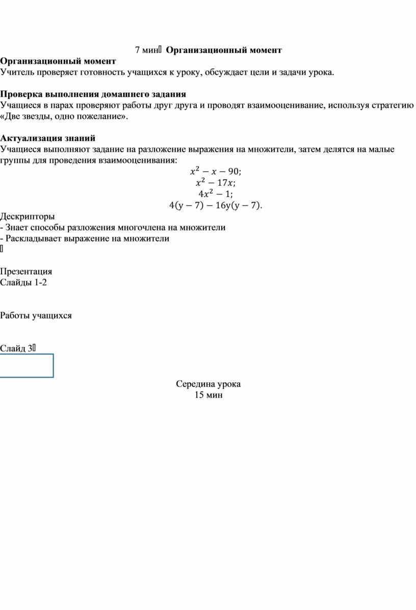 Актуализация знаний Учащиеся выполняют задание на разложение выражения на множители, затем делятся на малые группы для проведения взаимооценивания: