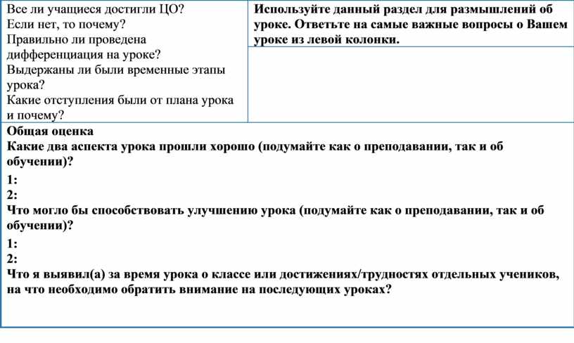 Используйте данный раздел для размышлений об уроке. Ответьте на самые важные вопросы о Вашем уроке из левой колонки. |