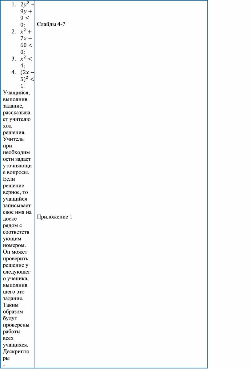 Закрепление новых способов действия Индивидуальная работа На доске записаны неравенства: 1. 2. 3. 4. 5. 6. 7. 8. Учащийся, выполнив задание, рассказывает учителю ход решения. Учитель при необходимости задает уточняющие вопросы. Если решение верное, то учащийся записывает свое имя на доске рядом с соответствующим номером. Он может проверить решение у следующего ученика, выполнившего это задание. Таким образом будут проверены работы всех учащихся. Дескрипторы - Раскладываетквадратный трехчлен на множители. - Отметить на числовой прямой значения переменных, при которых произведение равно нулю, и определяет знак произведения на каждом из полученных интервалов - Записывает решение неравенства