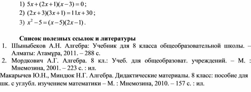 1. Шыныбеков А.Н. Алгебра: Учебник для 8 класса общеобразовательной школы. – Алматы: Атамұра, 2011. – 288 с.