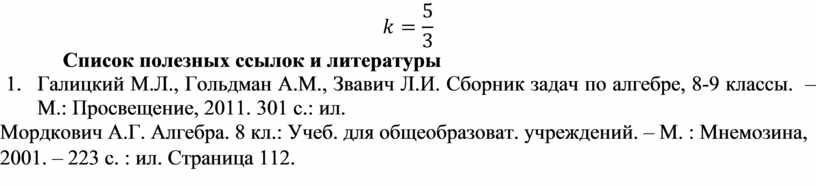 1. Галицкий М.Л., Гольдман А.М., Звавич Л.И. Сборник задач по алгебре, 8-9 классы. – М.: Просвещение, 2011. 301 с.: ил.