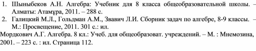 1. Шыныбеков А.Н. Алгебра: Учебник для 8 класса общеобразовательной школы. – Алматы: Атамұра, 2011. – 288 с.