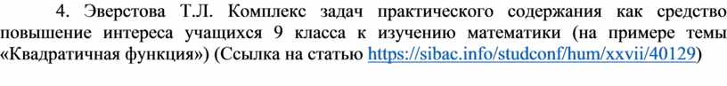 4. Эверстова Т.Л. Комплекс задач практического содержания как средство повышение интереса учащихся 9 класса к изучению математики (на примере темы «Квадратичная функция») (Ссылка на статью https://sibac.info/studconf/hum/xxvii/40129)