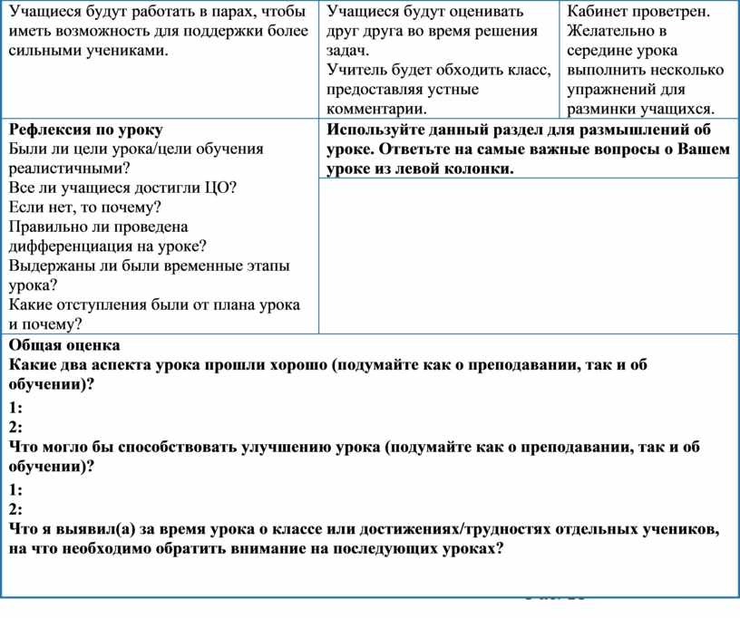 Общая оценка Какие два аспекта урока прошли хорошо (подумайте как о преподавании, так и об обучении)? 1: 2: Что могло бы способствовать улучшению урока (подумайте как о преподавании, так и об обучении)? 1: 2: Что я выявил(а) за время урока о классе или достижениях/трудностях отдельных учеников, на что необходимо обратить внимание на последующих уроках?