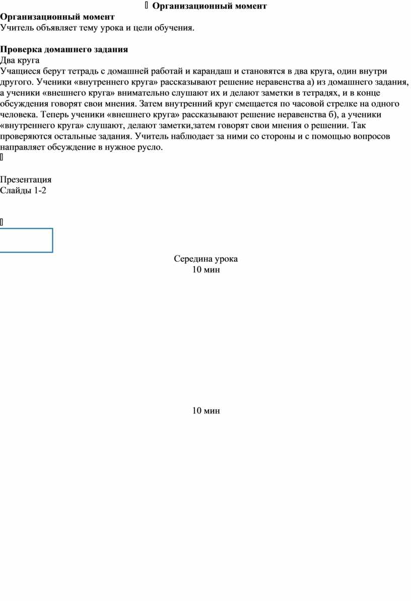 Проверка домашнего задания Два круга Учащиеся берут тетрадь с домашней работай и карандаш и становятся в два круга, один внутри другого. Ученики «внутреннего круга» рассказывают решение неравенства а) из домашнего задания, а ученики «внешнего круга» внимательно слушают их и делают заметки в тетрадях, и в конце обсуждения говорят свои мнения. Затем внутренний круг смещается по часовой стрелке на одного человека. Теперь ученики «внешнего круга» рассказывают решение неравенства б), а ученики «внутреннего круга» слушают, делают заметки,затем говорят свои мнения о решении. Так проверяются остальные задания. Учитель наблюдает за ними со стороны и с помощью вопросов направляет обсуждение в нужное русло.
