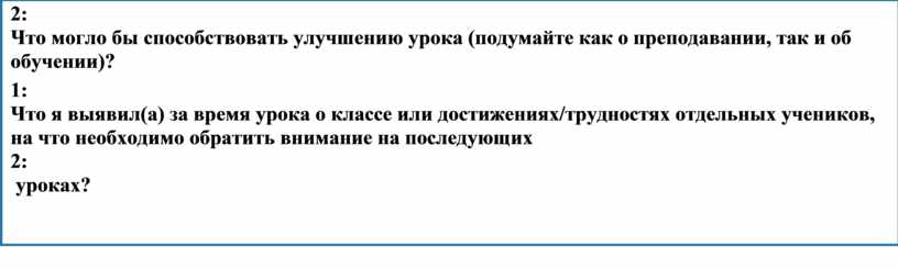 Общая оценка Какие два аспекта урока прошли хорошо (подумайте как о преподавании, так и об обучении)? 1: 2: Что могло бы способствовать улучшению урока (подумайте как о преподавании, так и об обучении)? 1: Что я выявил(а) за время урока о классе или достижениях/трудностях отдельных учеников, на что необходимо обратить внимание на последующих 2: уроках?