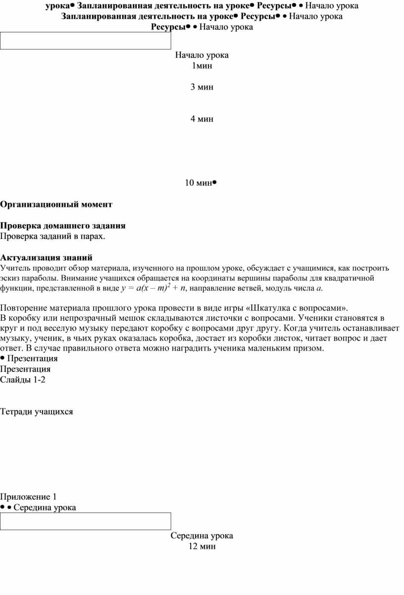 Актуализация знаний Учитель проводит обзор материала, изученного на прошлом уроке, обсуждает с учащимися, как построить эскиз параболы. Внимание учащихся обращается на координаты вершины параболы для квадратичной функции, представленной в виде y = a(x – m)2 + n, направление ветвей, модуль числа а.
