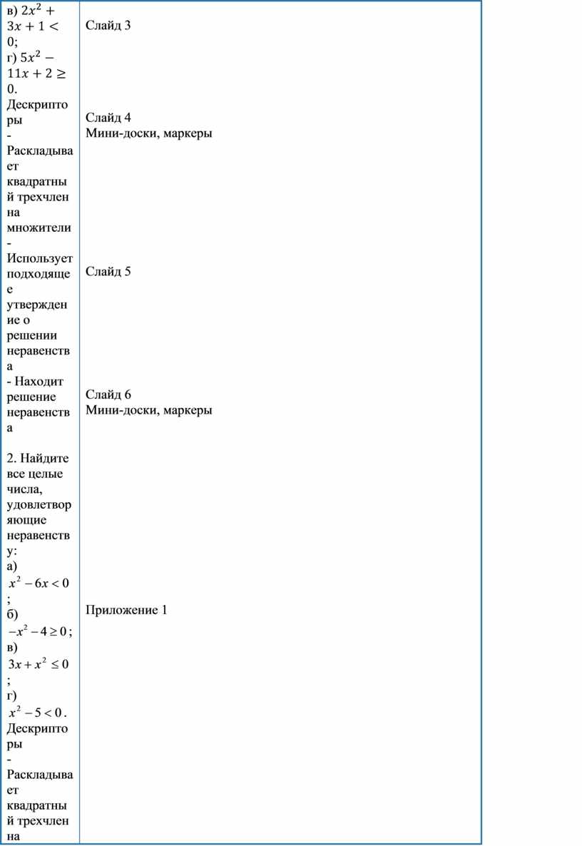2. Найдите все целые числа, удовлетворяющие неравенству: а) б) в) г) Дескрипторы - Раскладывает квадратный трехчлен на множители - Использует подходящее утверждение о решении неравенства - Находит решение неравенства - Записывает целые числа из найденного решения