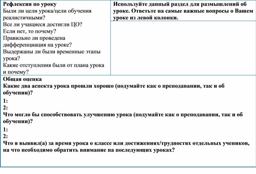 Используйте данный раздел для размышлений об уроке. Ответьте на самые важные вопросы о Вашем уроке из левой колонки. |