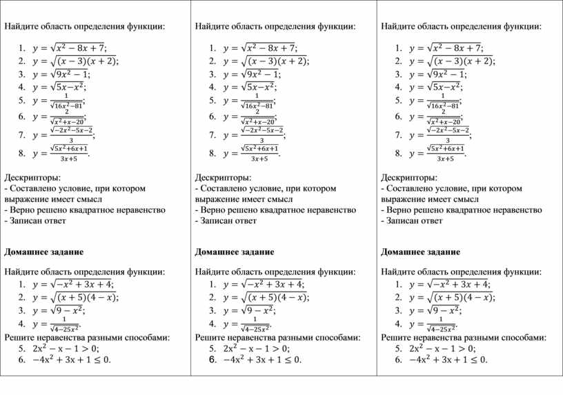 Домашнее задание Найдите область определения функции: 1. 2. 3.