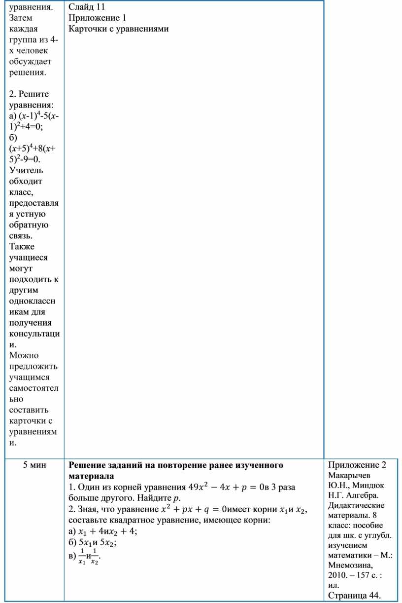 2. Решите уравнения: а) (x-1)4-5(x-1)2+4=0; б) (x+5)4+8(x+5)2-9=0. Учитель обходит класс, предоставляя устную обратную связь. Также учащиеся могут подходить к другим одноклассникам для получения консультации. Можно предложить учащимся самостоятельно составить карточки с уравнениями.