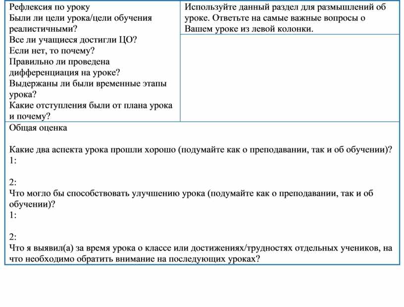 Используйте данный раздел для размышлений об уроке. Ответьте на самые важные вопросы о Вашем уроке из левой колонки. |