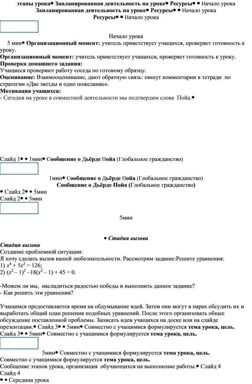 Стадия вызова Создание проблемной ситуации: Я хочу сделать вызов вашей любознательности. Рассмотрим задание:Решите уравнения: 1) х4 + 5х2 = 126; 2) (х2 – 1)2 –18(х2 – 1) + 45 = 0.