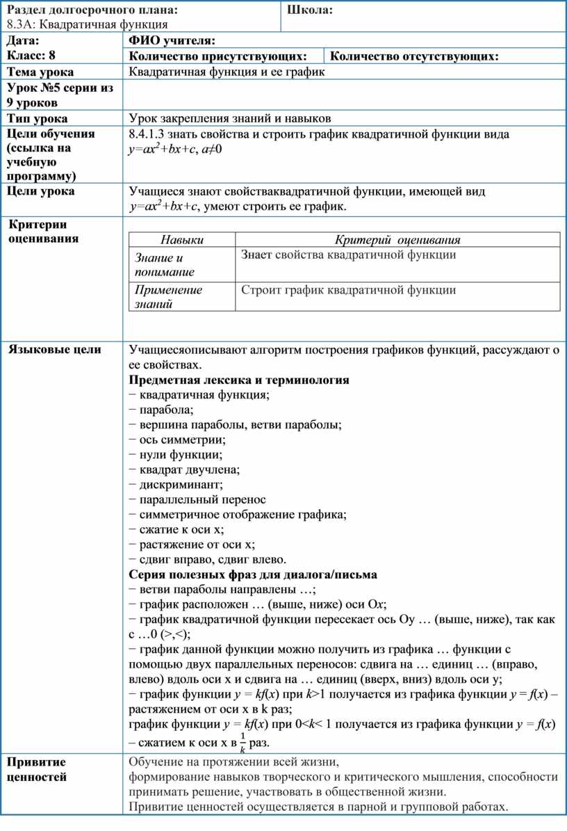 8.4.1.3 знать свойства и строить график квадратичной функции вида y=ax2+bx+c, a≠0 |