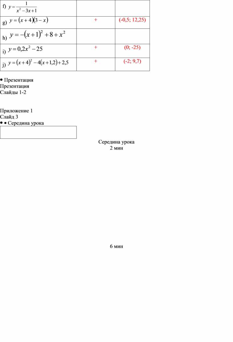 Учашиеся самостоятельно выполняют задания, затем в парах сверяют товеты, обсуждают, исправляют ошибки. Из данных функций выберите квадратичные и запишите координаты вершин соответствующих парабол: