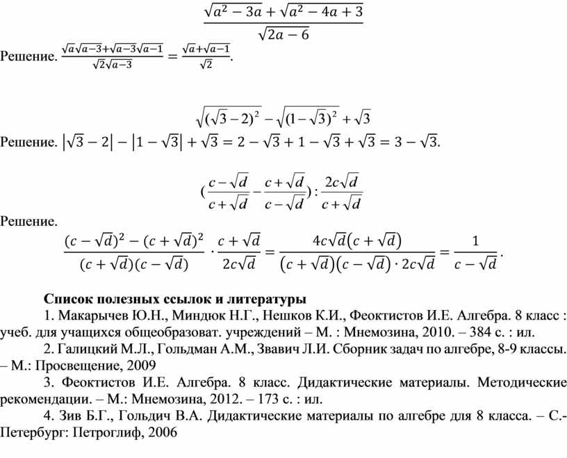 1. Макарычев Ю.Н., Миндюк Н.Г., Нешков К.И., Феоктистов И.Е. Алгебра. 8 класс : учеб. для учащихся общеобразоват. учреждений – М. : Мнемозина, 2010. – 384 с. : ил.
