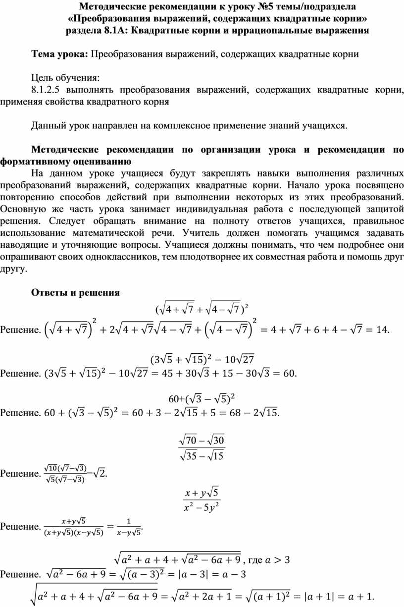 На данном уроке учащиеся будут закреплять навыки выполнения различных преобразований выражений, содержащих квадратные корни. Начало урока посвящено повторению способов действий при выполнении некоторых из этих преобразований. Основную же часть урока занимает индивидуальная работа с последующей защитой решения. Следует обращать внимание на полноту ответов учащихся, правильное использование математической речи. Учитель должен помогать учащимся задавать наводящие и уточняющие вопросы. Учащиеся должны понимать, что чем подробнее они опрашивают своих одноклассников, тем плодотворнее их совместная работа и помощь друг другу.