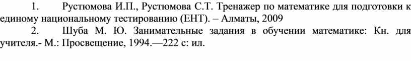 4. Рустюмова И.П., Рустюмова С.Т. Тренажер по математике для подготовки к единому национальному тестированию (ЕНТ). – Алматы, 2009