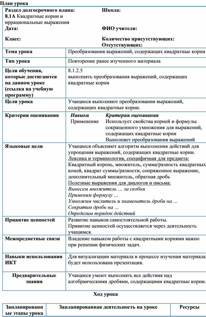 Раздел долгосрочного плана: 8.1А Квадратные корни и иррациональные выражения |