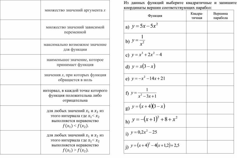 Из данных функций выберите квадратичные и запишите координаты вершин соответствующих парабол: