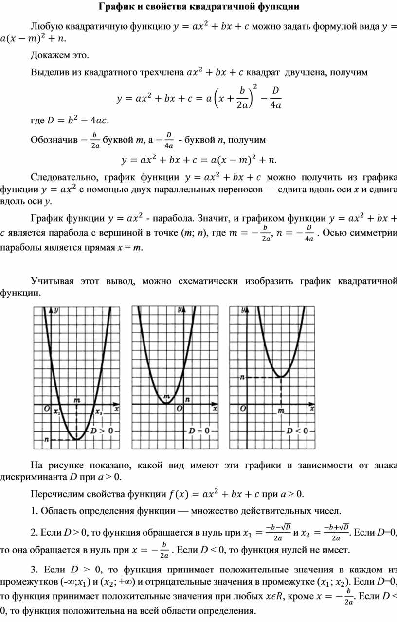 На рисунке показано, какой вид имеют эти графики в зависимости от знака дискриминанта D при а > 0.