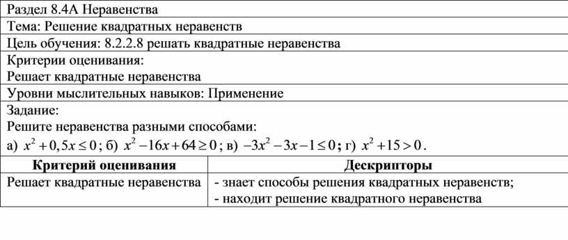 Цель обучения: 8.2.2.8 решать квадратные неравенства