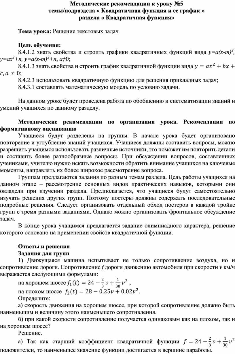 8.4.2.3 использовать квадратичную функцию для решения прикладных задач;