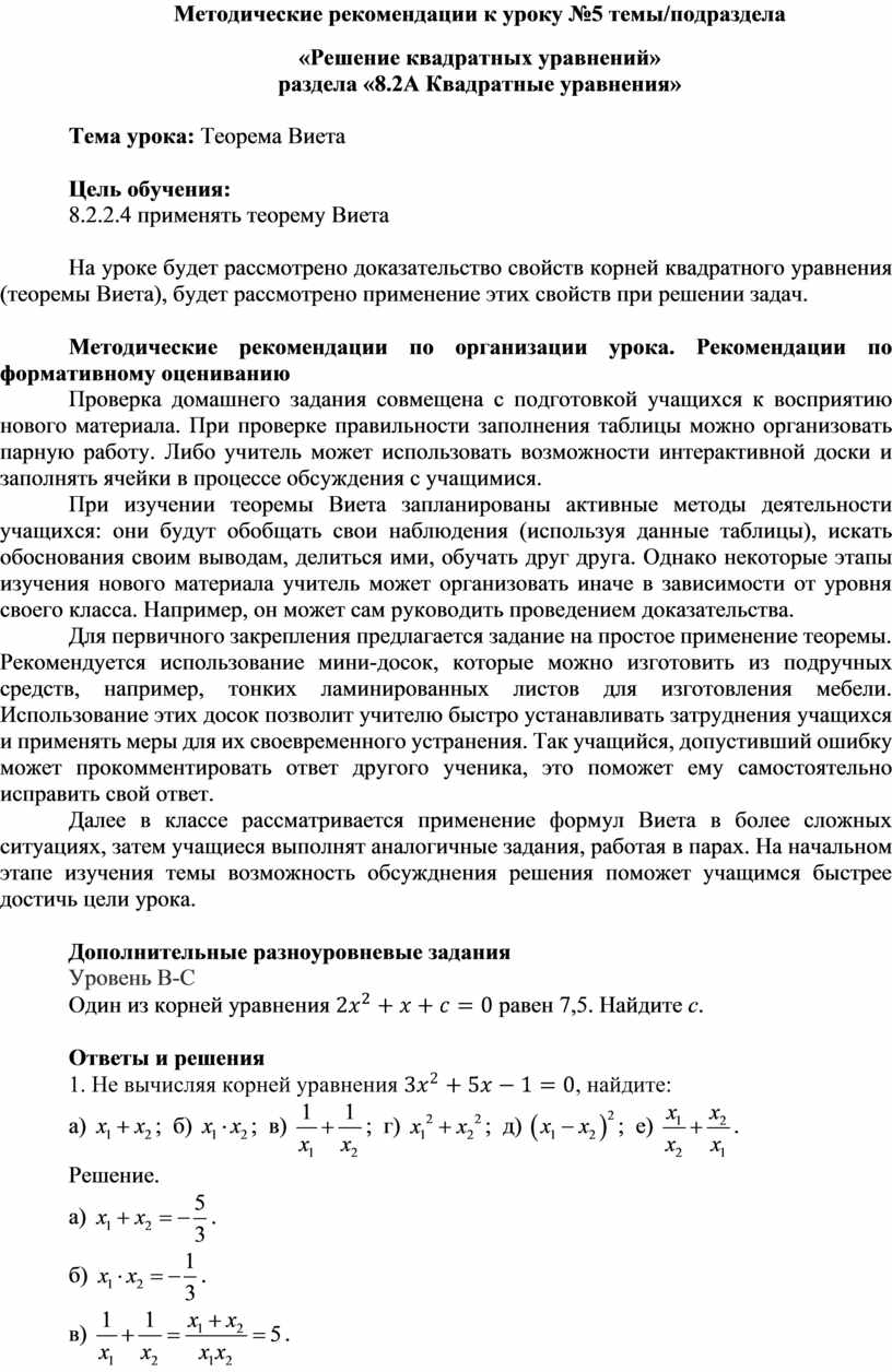 При изучении теоремы Виета запланированы активные методы деятельности учащихся: они будут обобщать свои наблюдения (используя данные таблицы), искать обоснования своим выводам, делиться ими, обучать друг друга. Однако некоторые этапы изучения нового материала учитель может организовать иначе в зависимости от уровня своего класса. Например, он может сам руководить проведением доказательства.
