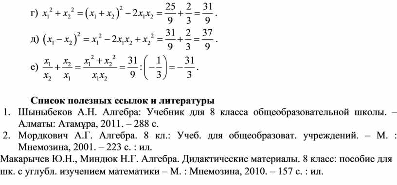 1. Шыныбеков А.Н. Алгебра: Учебник для 8 класса общеобразовательной школы. – Алматы: Атамұра, 2011. – 288 с.