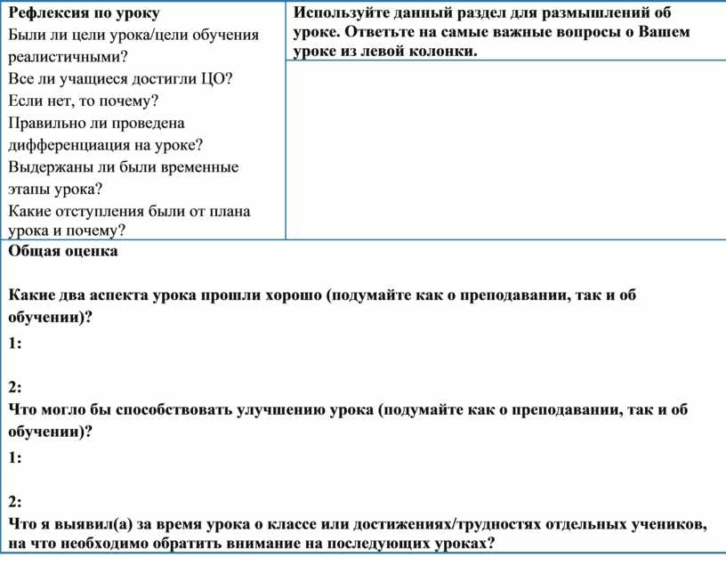 Используйте данный раздел для размышлений об уроке. Ответьте на самые важные вопросы о Вашем уроке из левой колонки. |
