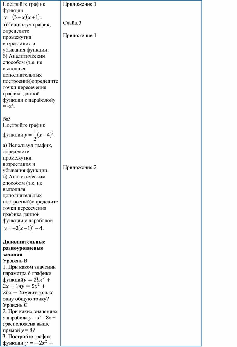 Учащиесяописывают алгоритм построения графиков функций, рассуждают о том, что необходимо знать для получения ответов на поставленные вопросы. Предметная лексика и терминология − квадратичная функция; − парабола; − вершина параболы, ветви параболы; − ось симметрии; − нули функции; − квадрат двучлена; − дискриминант; − параллельный перенос − симметричное отображение графика; − сжатие к оси х; − растяжение от оси х; − сдвиг вправо, сдвиг влево. Серия полезных фраз для диалога/письма − ветви параболы направлены …; − график расположен … (выше, ниже) оси Ох; − график квадратичной функции пересекает ось Оу … (выше, ниже), так как с …0 (>,<); − для определения промежутков знакопостоянства сначала найдем нули функции; − для определения множества значений функции достаточно найти ординату вершины параболы; − для определения промежутков монотонности функции достаточно найти абсциссу вершины параболы.