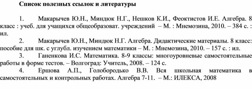 1. Макарычев Ю.Н., Миндюк Н.Г., Нешков К.И., Феоктистов И.Е. Алгебра. 8 класс : учеб. для учащихся общеобразоват. учреждений – М. : Мнемозина, 2010. – 384 с. : ил.