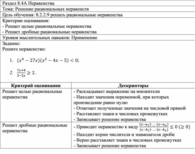 Цель обучения: 8.2.2.9 решать рациональные неравенства |