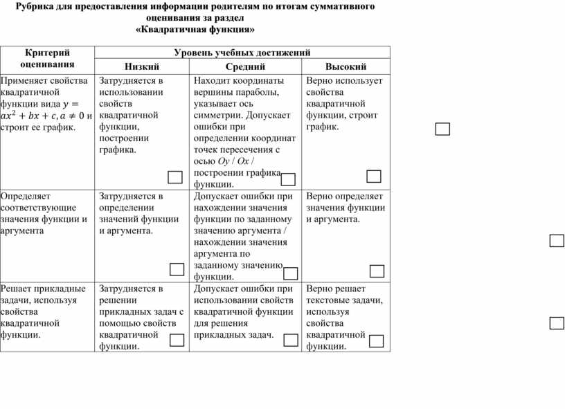 Рубрика для предоставления информации родителям по итогам суммативного оценивания за раздел