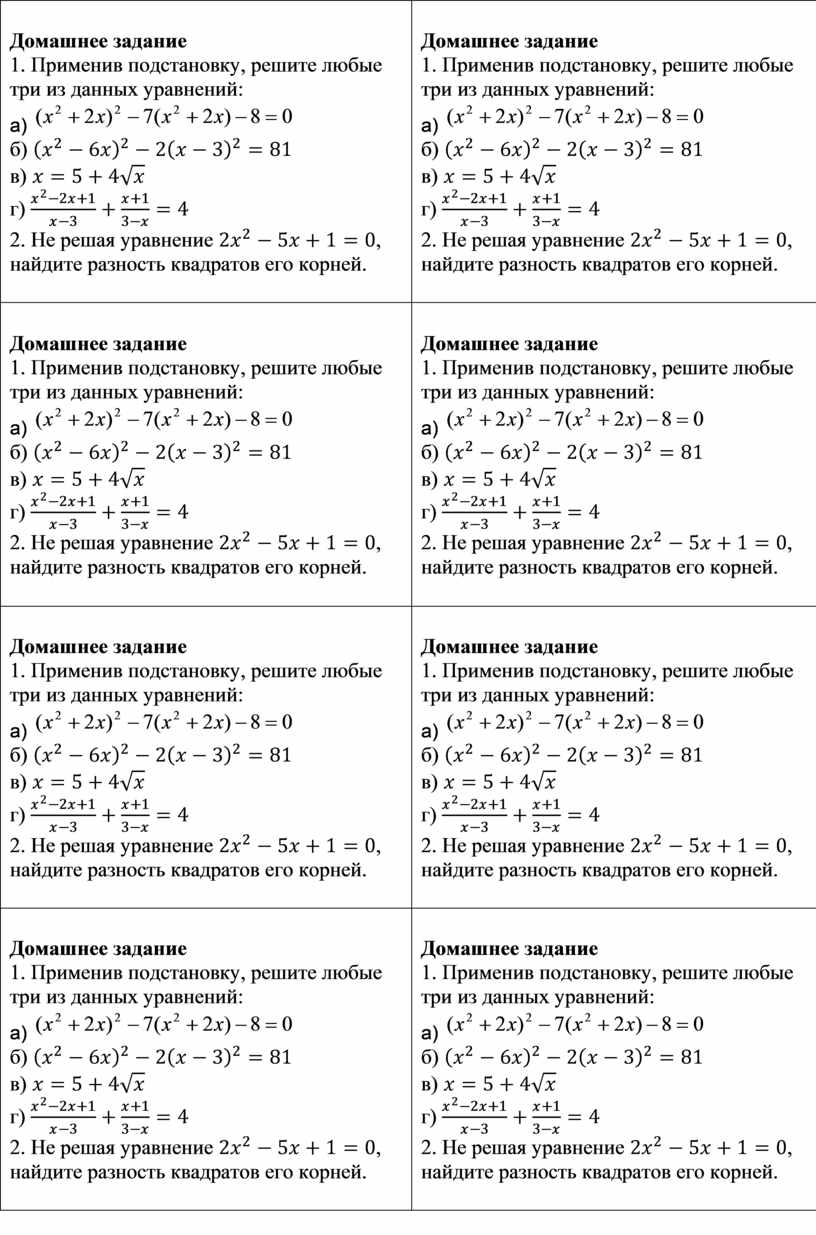 Домашнее задание 1. Применив подстановку, решите любые три из данных уравнений: а) б) в) г) 2. Не решая