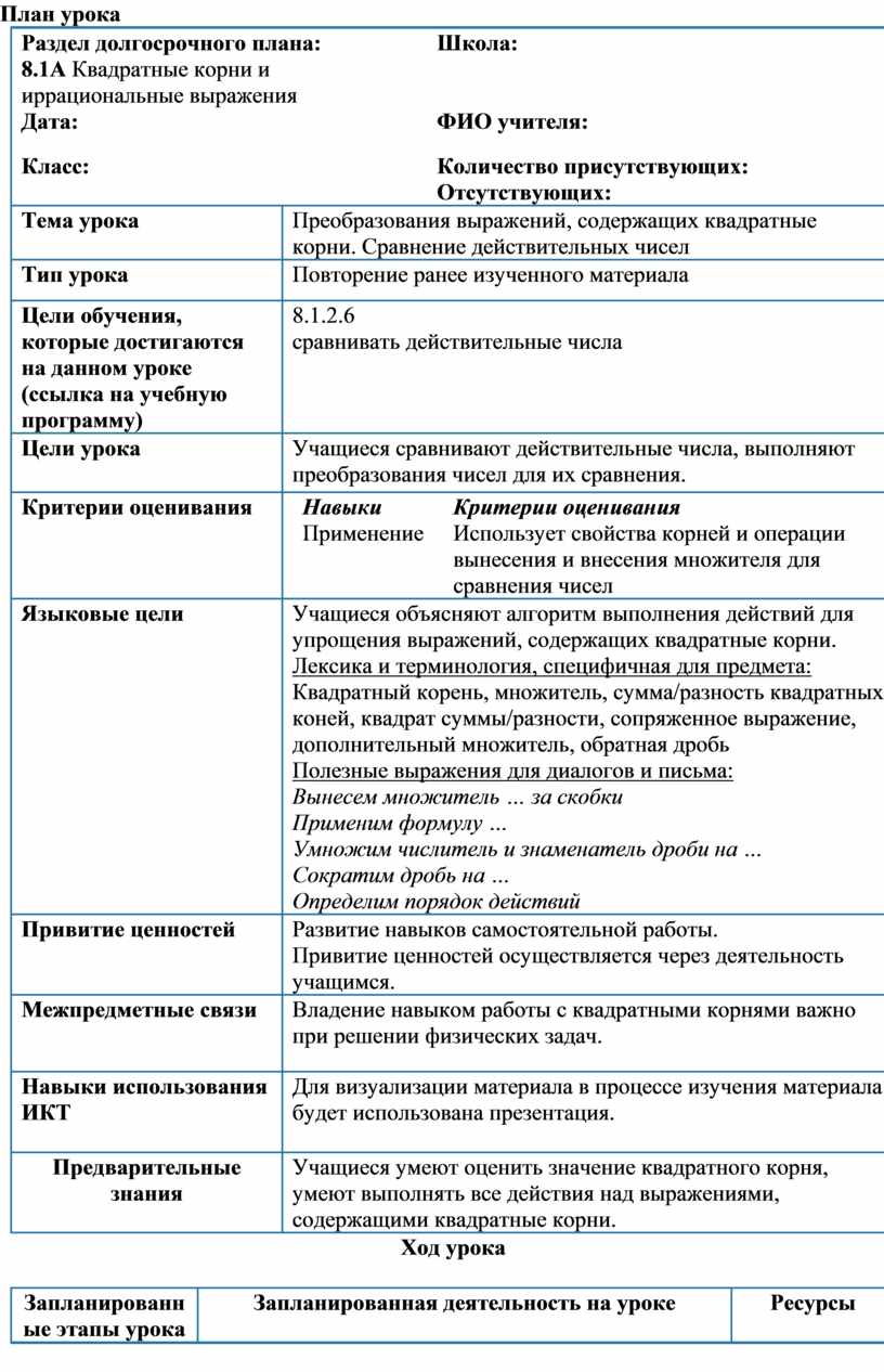 Раздел долгосрочного плана: 8.1А Квадратные корни и иррациональные выражения |