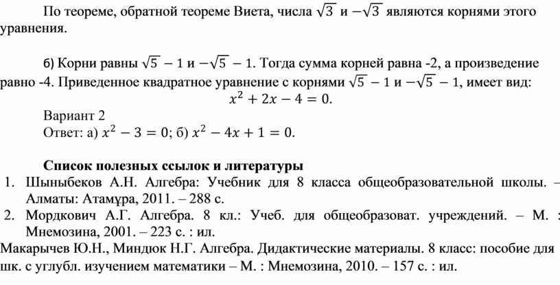 1. Шыныбеков А.Н. Алгебра: Учебник для 8 класса общеобразовательной школы. – Алматы: Атамұра, 2011. – 288 с.