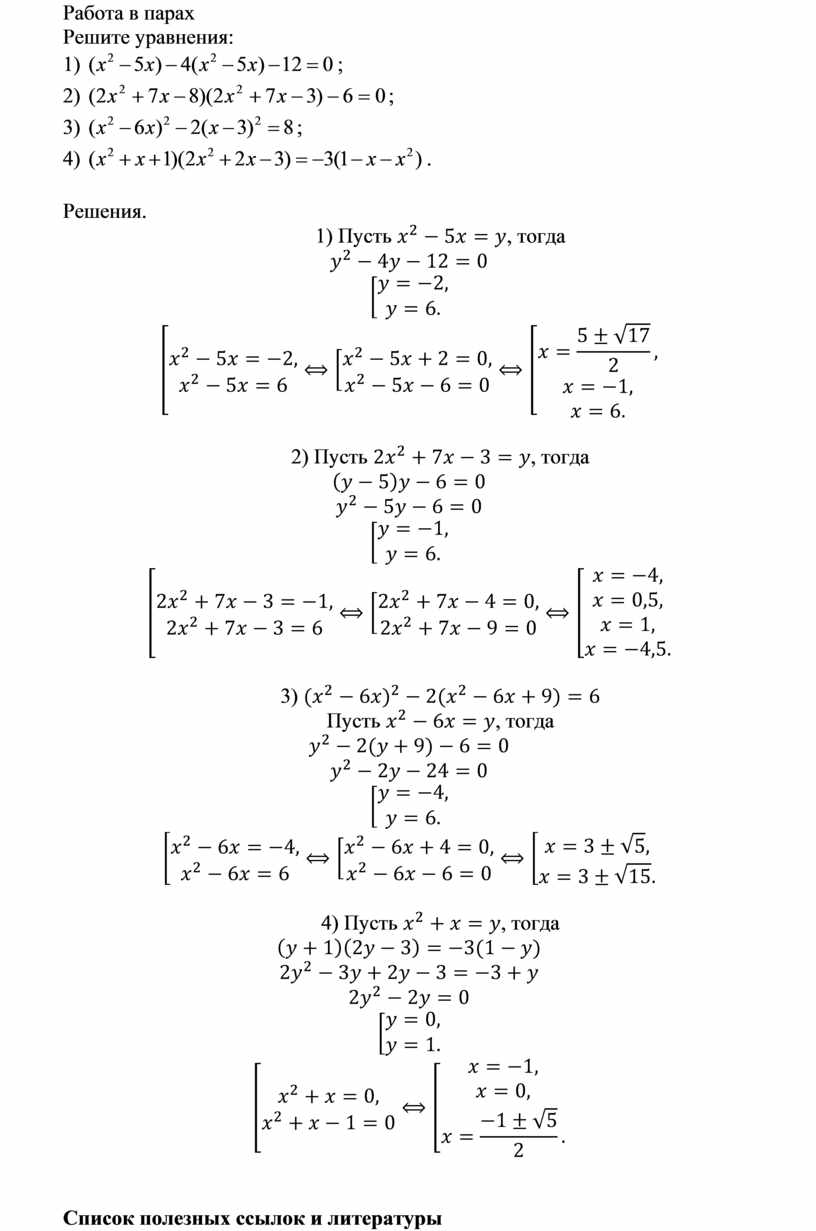 Способ решения уравнений путем подстановки был рассмотрен на предыдущем уроке для более простого случая – биквадратных уравнений. На данном уроке продолжается работа по формированию навыка применения этого способа. Трудность может заключаться в нахождении подходящей замены и получении корректного квадратного уравнения. Поэтому после обсуждения метода учащимся предлагается несколько устных упражнений на отработку указанных шагов в решении уравнений путем введения новой переменной.