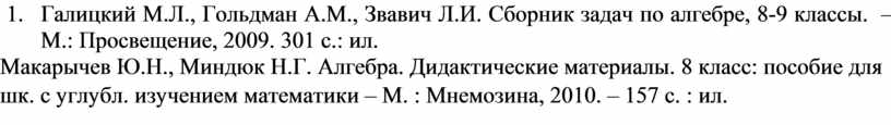 1. Галицкий М.Л., Гольдман А.М., Звавич Л.И. Сборник задач по алгебре, 8-9 классы. – М.: Просвещение, 2009. 301 с.: ил.