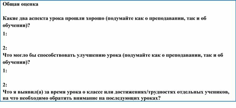 Какие два аспекта урока прошли хорошо (подумайте как о преподавании, так и об обучении)? 1: