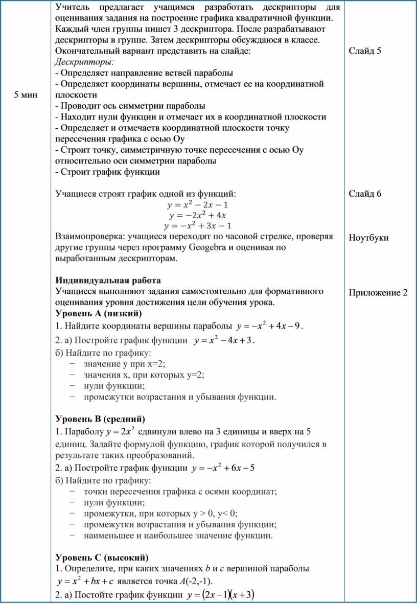 Учитель предлагает учащимся разработать дескрипторы для оценивания задания на построение графика квадратичной функции. Каждый член группы пишет 3 дескриптора. После разрабатывают дескрипторы в группе. Затем дескрипторы обсуждаюся в классе. Окончательный вариант представить на слайде: Дескрипторы: - Определяет направление ветвей параболы - Определяет координаты вершины, отмечает ее на координатной плоскости - Проводит ось симметрии параболы - Находит нули функции и отмечает их в координатной плоскости - Определяет и отмечаетв координатной плоскости точку пересечения графика с осью Оу - Строит точку, симметричную точке пересечения с осью Оу относительно оси симметрии параболы - Строит график функции