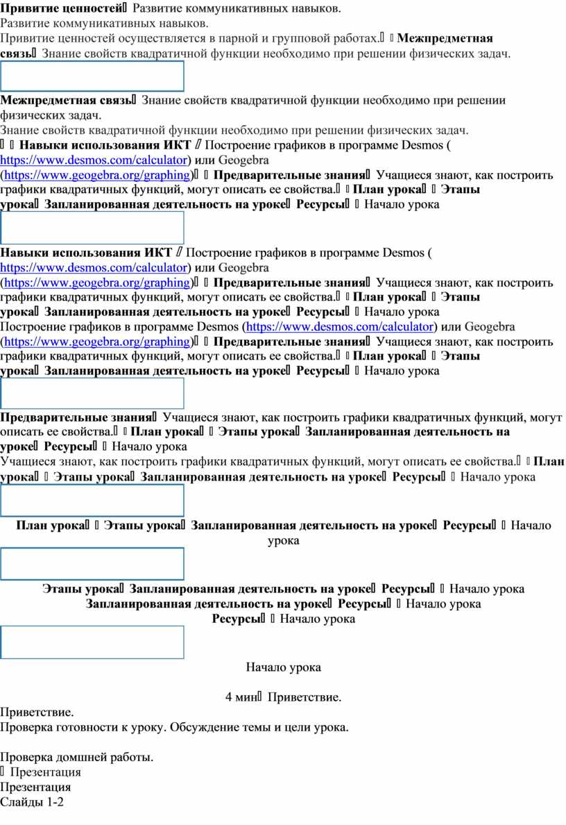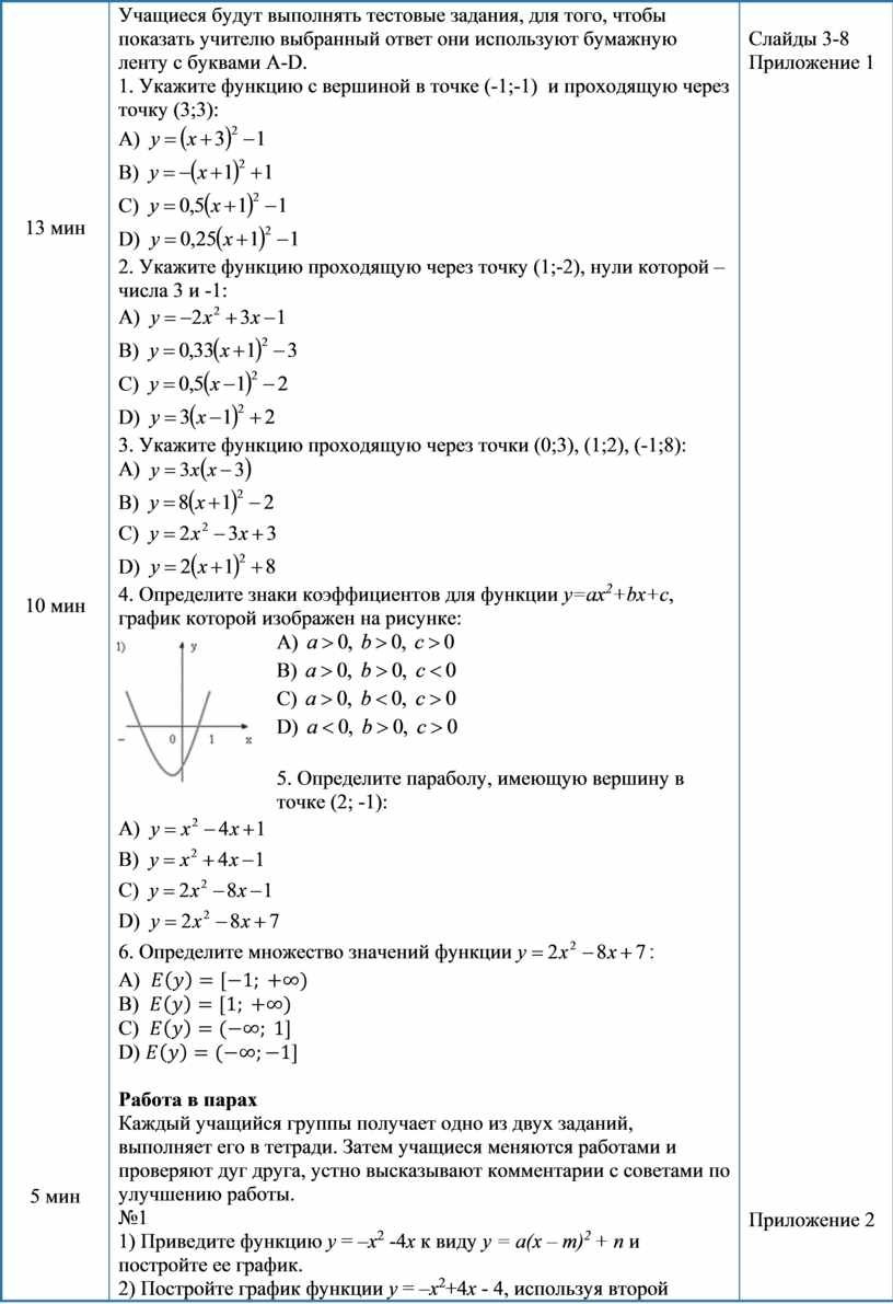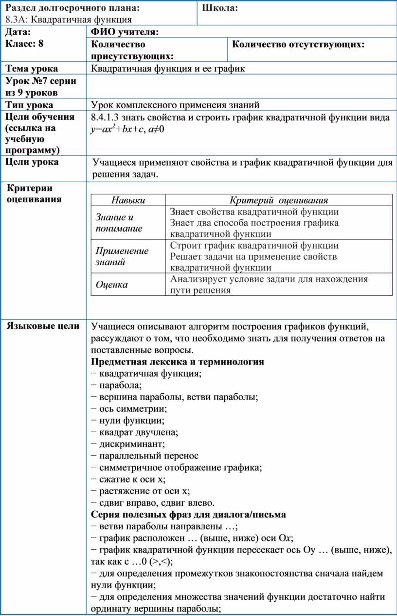Учащиеся описывают алгоритм построения графиков функций, рассуждают о том, что необходимо знать для получения ответов на поставленные вопросы. Предметная лексика и терминология − квадратичная функция; − парабола; − вершина параболы, ветви параболы; − ось симметрии; − нули функции; − квадрат двучлена; − дискриминант; − параллельный перенос − симметричное отображение графика; − сжатие к оси х; − растяжение от оси х; − сдвиг вправо, сдвиг влево. Серия полезных фраз для диалога/письма − ветви параболы направлены …; − график расположен … (выше, ниже) оси Ох; − график квадратичной функции пересекает ось Оу … (выше, ниже), так как с …0 (>,<); − для определения промежутков знакопостоянства сначала найдем нули функции; − для определения множества значений функции достаточно найти ординату вершины параболы; − для определения промежутков монотонности функции достаточно найти абсциссу вершины параболы.