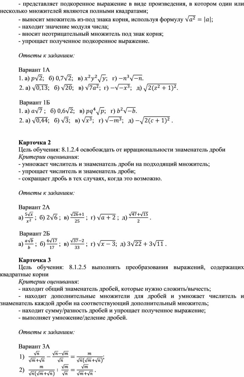 Цель обучения: 8.1.2.5 выполнять преобразования выражений, содержащих квадратные корни