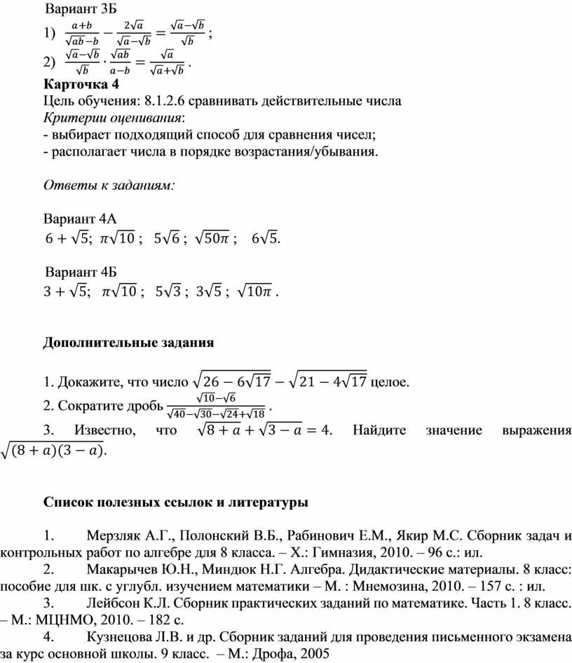 3. Лейбсон К.Л. Сборник практических заданий по математике. Часть 1. 8 класс. – М.: МЦНМО, 2010. – 182 с.
