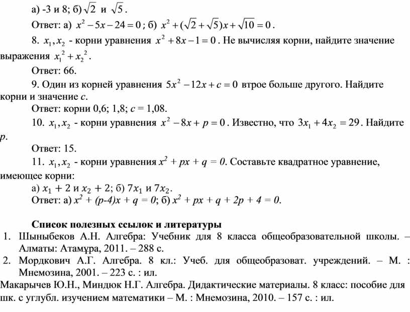 1. Шыныбеков А.Н. Алгебра: Учебник для 8 класса общеобразовательной школы. – Алматы: Атамұра, 2011. – 288 с.