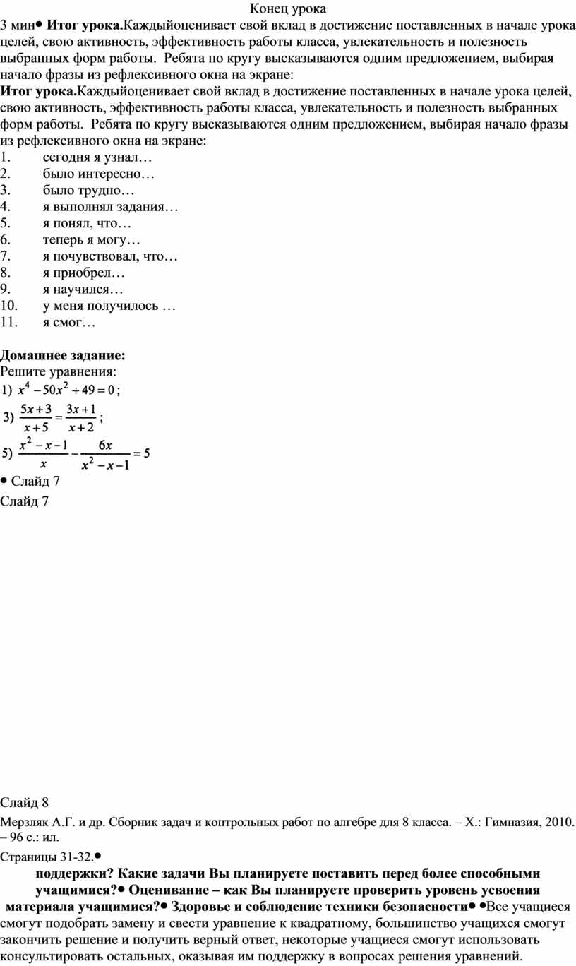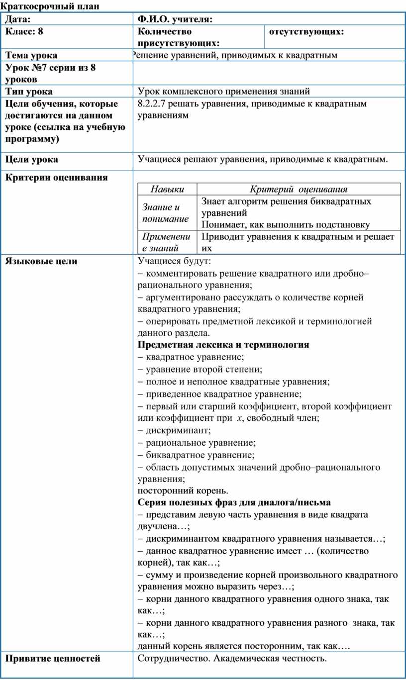 8.2.2.7 решать уравнения, приводимые к квадратным уравнениям |