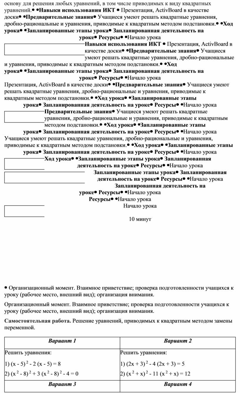 Организационный момент. Взаимное приветствие; проверка подготовленности учащихся к уроку (рабочее место, внешний вид); организация внимания. Самостоятельная работа. Решение уравнений, приводимых к квадратным методом замены переменной.