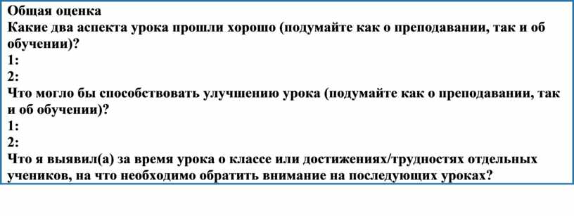 Общая оценка Какие два аспекта урока прошли хорошо (подумайте как о преподавании, так и об обучении)? 1: 2: Что могло бы способствовать улучшению урока (подумайте как о преподавании, так и об обучении)? 1: 2: Что я выявил(а) за время урока о классе или достижениях/трудностях отдельных учеников, на что необходимо обратить внимание на последующих уроках? |
