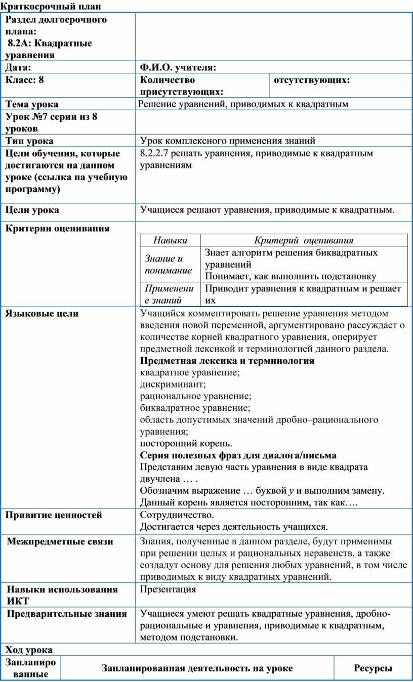 8.2.2.7 решать уравнения, приводимые к квадратным уравнениям |