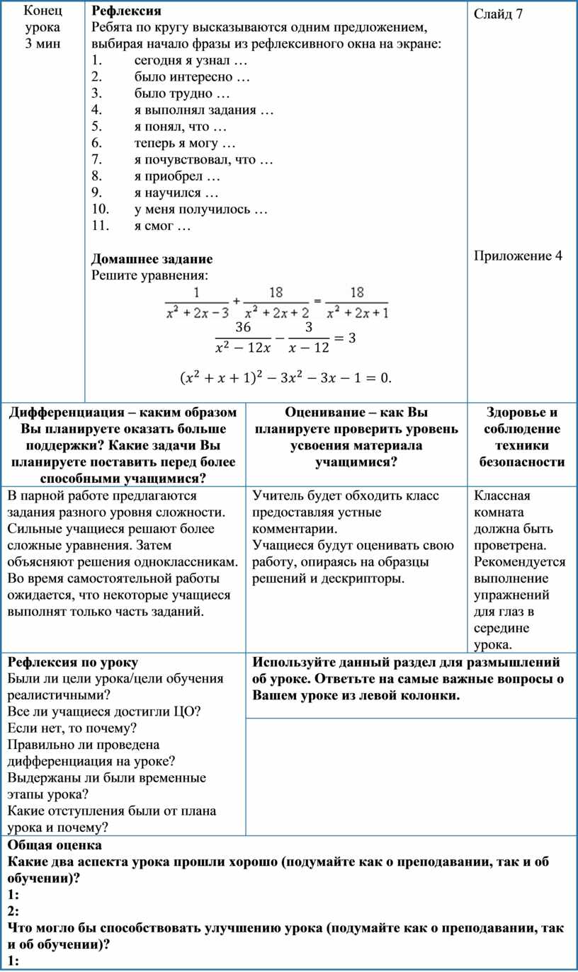 Используйте данный раздел для размышлений об уроке. Ответьте на самые важные вопросы о Вашем уроке из левой колонки. |